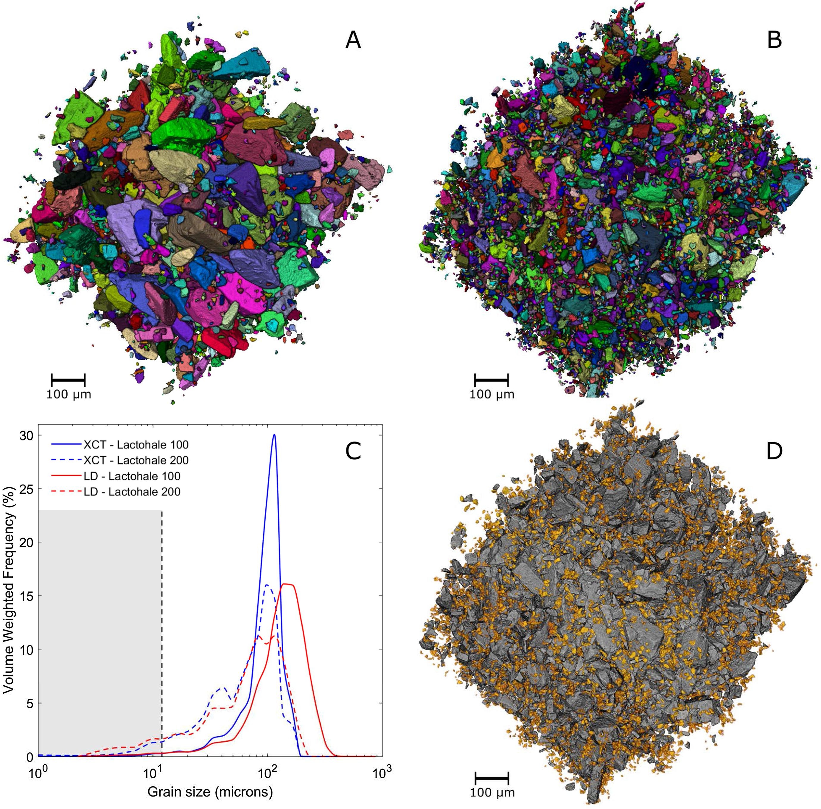 Carrier-based dry powder inhaler (DPI) formulations need to be accurately characterised for their particle size distributions, surface roughnesses, fines contents and flow properties. Understanding the micro-structure of the powder formulation is crucial, yet current characterisation methods give incomplete information. Commonly used techniques like laser diffraction (LD) and optical microscopy (OM) are limited due to the assumption of sphericity and can give variable results depending on particle orientation and dispersion. The aim of this work was to develop new three dimensional (3D) powder analytical techniques using X-ray computed tomography (XCT) that could be employed for non-destructive metrology of inhaled formulations.