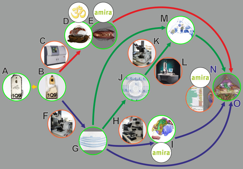 In biomedical research, a huge variety of different techniques is currently available for the structural examination of small specimens, including conventional light microscopy (LM), transmission electron microscopy (TEM), confocal laser scanning microscopy (CLSM), microscopic X-ray computed tomography (microCT), and many others. Since every imaging method is physically limited by certain parameters, a correlative use of complementary methods often yields a significant broader range of information. Here we demonstrate the advantages of the correlative use of microCT, light microscopy, and transmission electron microscopy for the analysis of small biological samples.