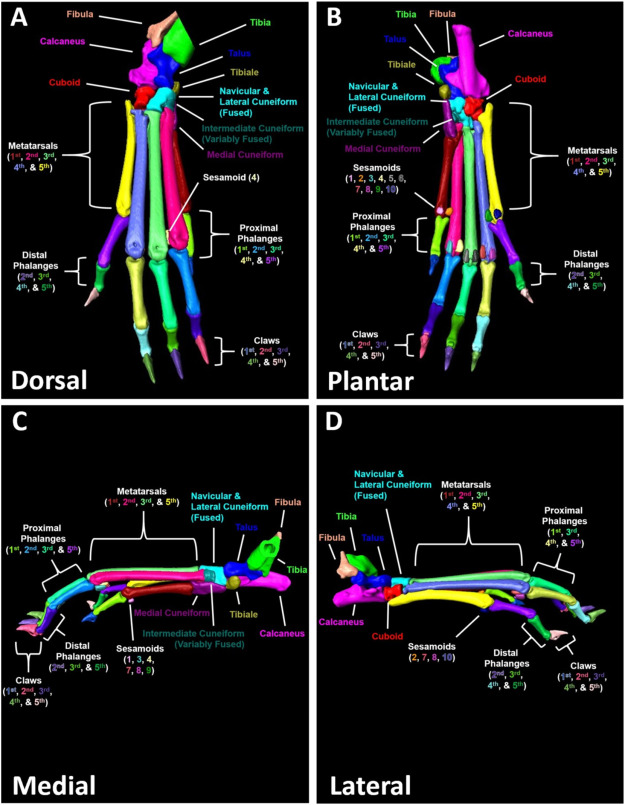 Micro-computed tomography (μCT) is a valuable imaging modality for longitudinal quantification of bone volumes to identify disease or treatment effects for a broad range of conditions that affect bone health. Complex structures, such as the hindpaw with up to 31 distinct bones in mice, have considerable analytic potential, but quantification is often limited to a single bone volume metric due to the intensive effort of manual segmentation. Herein, we introduce a high-throughput, user-friendly, and semi-automated method for segmentation of murine hindpaw μCT datasets.
