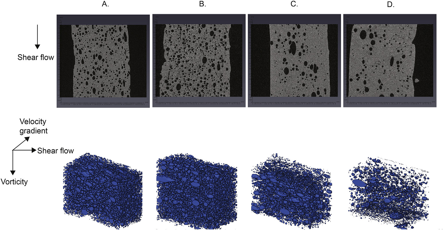 The 3D images were analyzed using Avizo imaging software version 9.3.0, including the total sample volume, total gas volume, gas void fraction (p), every single bubble volume, and its length, width and degree of deformation (Def).