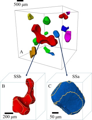 The tomograms obtained from the X-ray micro-CT scan of the Ketton–brine–decane system with the procedure described in Section 2.1 are post-processed with the Avizo software: the images are filtered and segmented with the techniques mentioned in Section 2.2 and illustrated in Fig. 1. One ganglion of oil is selected from the water-wet dataset and the manual method described in Section 2.3 is used to obtain contact angle estimations in a total of 44 of its three-phase contact points, on grey-scale images. The automatic algorithm is applied on slices of segmented images with the same orientation as those used for the manual method, on the very same points. A comparison between contact angle values obtained through the manual and automated methods is rendered by the scatterplot depicted in Fig. 4. Overall, the agreement between the results obtained with the two methods can be considered as mutually consistent.