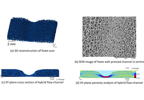 A ‘hybrid’ foam flow-field is presented consisting of flow channels pressed into the foam to promote flow distribution and reduce pressure drop. Cross- and through-channel pressure drop measurements are conducted, along with X-ray CT analysis.