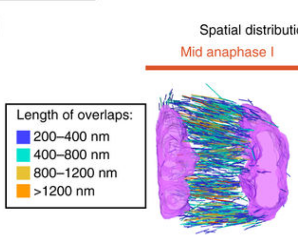 The Amira software was used for the segmentation and automated tracing of microtubules. Stitching of the 5 serial tomogram slices and their corresponding microtubule traces was performed in Amira. Automatic microtubule tracing was then visually inspected and manually edited for potential tracing errors or omissions. Chromosome masses were segmented manually in Amira. Microtubule lengths and orientations were directly extracted from Amira.