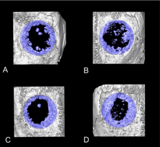 The micro-CT images were then analyzed and reconstructed by using 3D structural analysis software (Amira, Visualization Sciences Group, Düsseldorf, Germany). The volume of interest (VOI) was a 10-mm diameter, full thickness cylinders, selected corresponding to the dimensions of the defect sites. 2D parameters included defect closure measured on the horizontal plane (DC, relative % to whole surface at the defect site) and bone height (BH) measured on the sagittal plane, at the middle 5 mm (BH_M) and at the lateral part of the defect (BH_L). Bone volume (BV, mm3), BV fraction (BV/TV, ratio of the segmented BV to the total VOI) and relative BD (BD, relative % to initial bone at the defect site) were calculated. The micro-CT data of the harvested bone disc was used as reference threshold values for the BD analyses of tested groups.