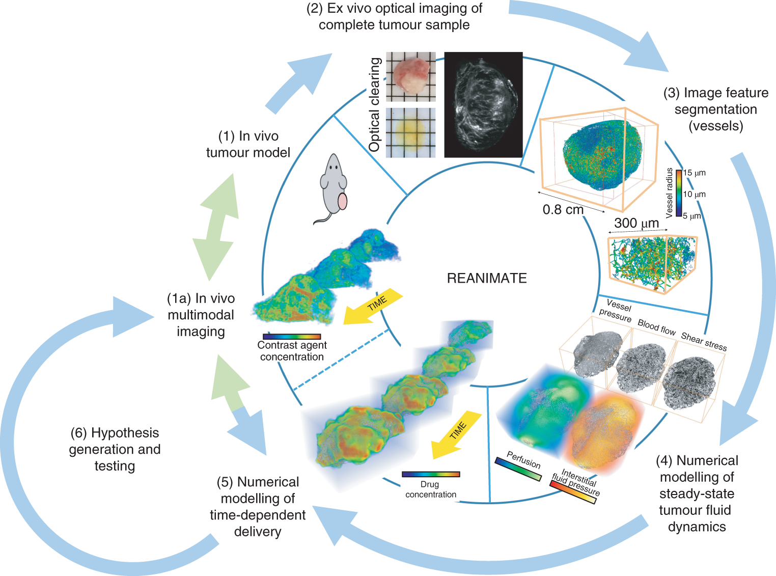 This complex physiological-pharmacological landscape requires careful analysis in order to be fully understood. The numerical modelling component of REANIMATE consists of two steps. First, a solution is sought from a set of coupled fluid dynamics models that describe steady-state vascular and interstitial fluid transport. Second, the steady-state solution (or set of solutions) is used to parameterize a time-dependent model that describes the vascular and interstitial uptake of exogenously administered material. This can be used, for example, to model the heterogeneous pharmacokinetics of drug or imaging contrast agents, or the delivery of individual particles (for example T cells, antibodies), and terms can be introduced to describe drug targeting and metabolism.