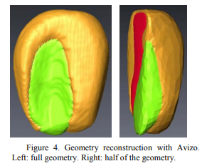 The 2D slices obtained using micro CT were reconstructed into a 3D volumetric dataset using Avizo. A multiresolution algorithm is used by Avizo to ensure the best quality and performance that are supported by available resources on various display hardware. After appropriate filtering, automatic and interaction segmentation algorithms were adopted to segment the corn kernel into various components such as hard endosperm, soft endosperm and germ. Figure 3 demonstrates the Avizo user interface for completing this task. The voxels of interest can be selected automatically, using thresholds or magic wand for example, or interactively using methods such as growing contour. The segmentation is a twopass workflow, separating voxel selection and voxel assignment, to ensure greatest flexibility in creating, modifying, and managing different materials. In both voxel selection and assignment, automatic and interactive tools can be used in combination. Avizo also provided semi-automatic tools such as interpolation and warping to ensure the right balance of user interactivity and automation.