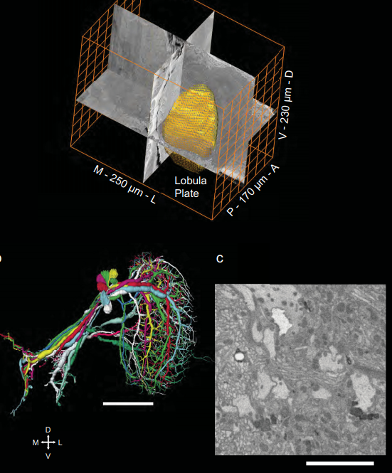 With the advent of neurogenetic methods, the neural basis of behavior is presently being analyzed in more and more detail. This is particularly true for visually driven behavior of Drosophila melanogaster where cell-specific driver lines exist that, depending on the combination with appropriate effector genes, allow for targeted recording, silencing and optogenetic stimulation of individual cell-types. Together with detailed connectomic data of large parts of the fly optic lobe, this has recently led to much progress in our understanding of the neural circuits underlying local motion detection. However, how such local information is combined by optic flow sensitive large-field neurons is still incompletely understood. Here, we aim to fill this gap by a dense reconstruction of lobula plate tangential cells of the fly lobula plate. These neurons collect input from many hundreds of local motion-sensing T4/T5 neurons and connect them to descending neurons or central brain areas. We confirm all basic features of HS and VS cells as published previously from light microscopy. In addition, we identified the dorsal and the ventral centrifugal horizontal, dCH and vCH cell, as well as three VSlike cells, including their distinct dendritic and axonal projection area.