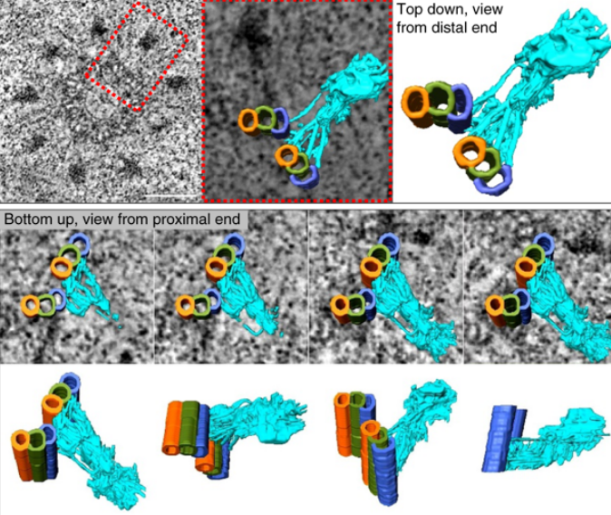 Segmentation of the tomogram and visualization of the distal appendage were carried out using the 3D interactive tool in Amira software (Thermo Fisher). Before segmentation, the “slicer” function in IMOD software was used to rotate the tomogram and look for a suitable orientation for convenient visualization and model building. Based on the orientation parameters in “slicer”, the tomogram was rotated using programs in Bsoft package. The re-orientated tomogram was imported into Amira software for structural visualization, model building, and movies making.