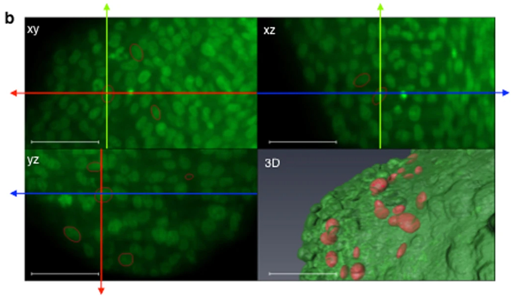 Multicellular tumour spheroids are used as a culture model to reproduce the 3D architecture, proliferation gradient and cell interactions of a tumour micro-domain. However, their 3D characterization at the cell scale remains challenging due to size and cell density issues. In this study, we developed a methodology based on 3D light sheet fluorescence microscopy (LSFM) image analysis and convex hull calculation that allows characterizing the 3D shape and orientation of cell nuclei relative to the spheroid surface. By using this technique and optically cleared spheroids, we found that in freely growing spheroids, nuclei display an elongated shape and are preferentially oriented parallel to the spheroid surface. This geometry is lost when spheroids are grown in conditions of physical confinement. Live 3D LSFM analysis of cell division revealed that confined growth also altered the preferential cell division axis orientation parallel to the spheroid surface and induced prometaphase delay. These results provide key information and parameters that help understanding the impact of physical confinement on cell proliferation within tumour micro-domains.
