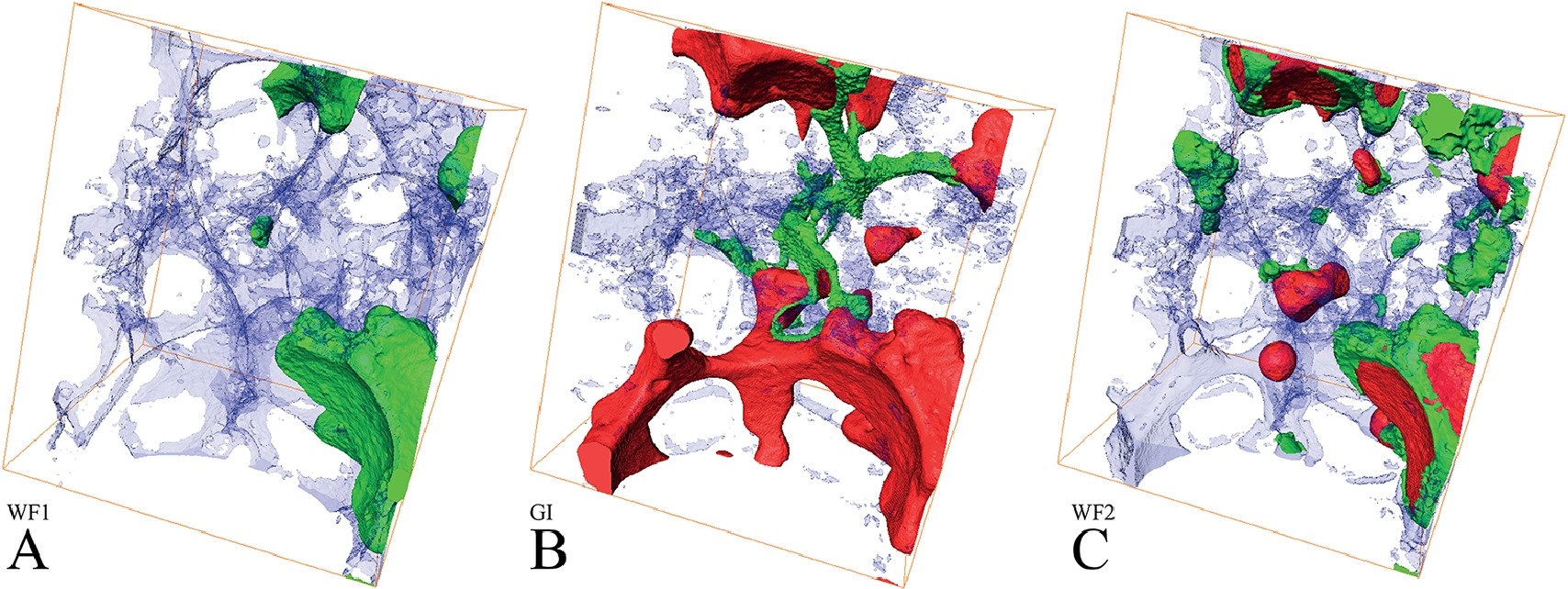 The segmentation of the lower resolution images was performed using a watershed method with the possibility of selecting different gradient values for different phases (2D-histogram segmentation function of Avizo).