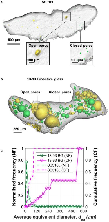 For the XCT dataset, we quantified the pore size distribution of both melt tracks in 3D using Avizo 9.1 (Thermo Fisher Scientific, US) and the method described in the literature [13,56]. We discarded any segmented objects with a volume fewer than five voxels (equivalent to a diameter of 6.75 µm) to minimize quantification errors induced by image noise.