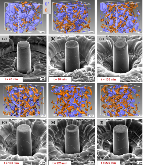 A unique approach to correlating an evolving 3D microstructure in an Al-Cu alloyand its micro-scale mechanical properties has been introduced. Using these nanoscale three-dimensional microstructures derived from Transmission X-rayMicroscopy (TXM), individual contributions from different strengthening mechanisms were quantified. The spatial distribution and morphology of the individual θ′ and θ phases were seen to play an important role in influencing dislocation storage. Uniaxial micro-compression experiments were used to quantify the stress-strain response of the alloy at different aging times. Transmission electron microscopy (TEM) aided in discerning dislocation activity at these precipitates. A model is proposed to accurately predict the variation in yield stressby using appropriate morphological parameters from the 3D microstructure and its validity has been corroborated using experimental measurements. Distributions of 2D and 3D inter-precipitate spacing were seen to provide crucial insights on influencing deformation in such precipitation-strengthened alloys. Finally, the transition in deformation behavior and origin of numerous strain bursts were investigated using in situ micropillar compression testing.