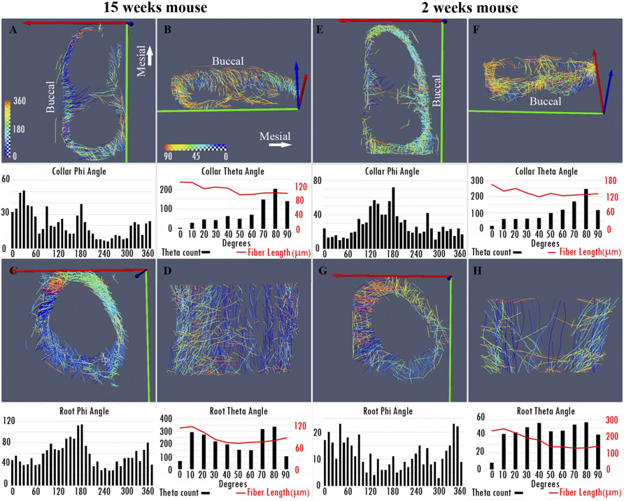 Directionality Analysis. Visualizing the entire PDL fibrous component in 3D revealed that the longitudinal backbone of the fibers displays a certain directionality in the mesial–distal direction. We therefore carried out a 3D directionality analysis comparing the phi and theta angles for fully functioning PDL and preeruptive state PDL. For the analysis, we used the cylinder correlation and trace correlation line modules in Avizo software (Xfiber Extension version 9.4, Thermo Scientific).