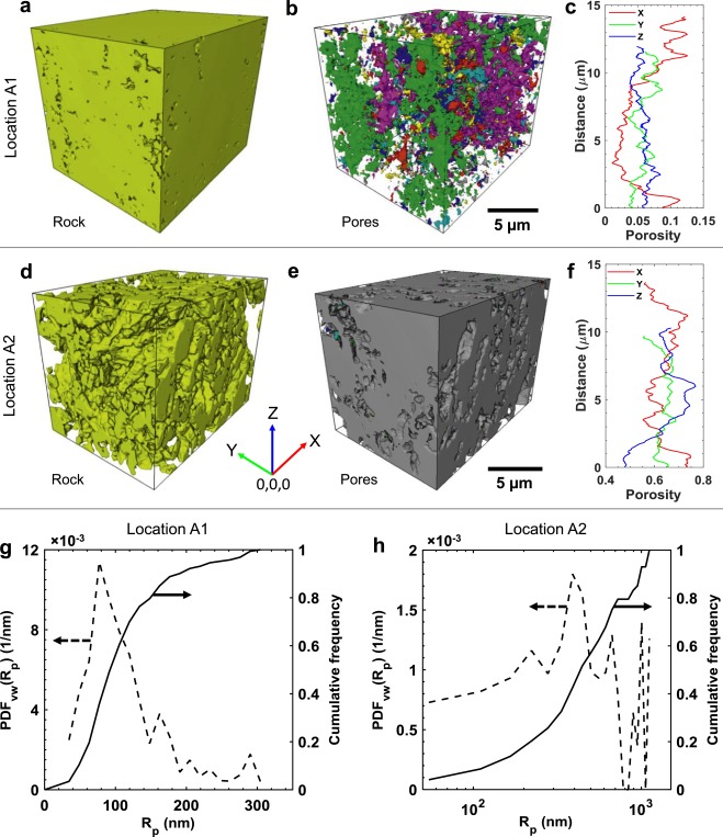 The tomograms were reconstructed using proprietary software provided by Zeiss and processed using Avizo 9 software unless otherwise specified. The tomograms were pre-processed to remove distorted outer regions. The stitched image (5 µm voxel size) of the dry rock sample was filtered using a non-local means edge preserving filter. This was then segmented into two phases (solid and pore space) using a seeded watershed algorithm based on the gray-scale gradient and gray-scale intensity of each voxel.