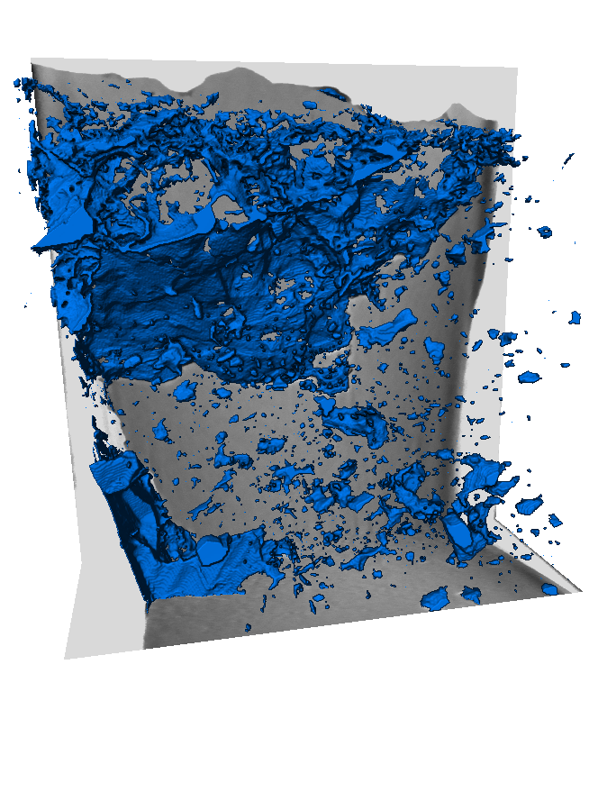 These limitations are derived from artifacts that occur during the acquisition of the data. Collecting data using a FIBSEM is a destructive, serial sectioning technique. A thin slice of material is milled away, the resulting surface imaged, and the process repeated until the requested volume is generated. However, porous materials, by their very nature, create some issues in how to interpret the data that are produced. When each slice is imaged, the empty space (pores and large cracks) are included in the images. If the pore is not deep enough to trap electrons forming a “black” pore synonymous with empty space in SEM imaging, or if it has been filled with redeposited material as a result of the milling process, the back of the pore or other pore filling materials will be imaged. These “pore backs” often termed “pore shine” or “shine through” artifacts make defining the true area of a pore in 2D (volume in 3D) extremely difficult to quantify during post processing using image analysis software.