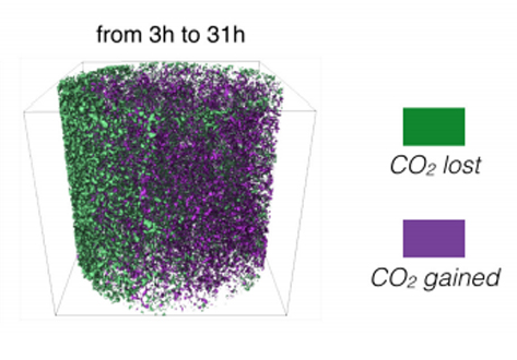 Despite its major influence on storage capacity, CO2 plume migration rate, and rates of CO2 dissolution and mineralization, there are outstanding questions regarding the mechanisms, times scales, influence of geological heterogeneity, and degree of residual trapping. The aim of the present study is to track temporal evolution of residually-trapped scCO2 ganglia during the early stages following imbibition, extract critical parameters such as fluid phase connectivity and scCO2 cluster size and quantify their evolution with time using synchrotron X-ray micro-CT imaging.