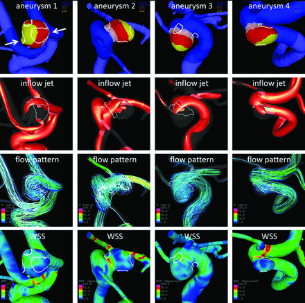 Twenty-three intracranial aneurysms imaged with 7T MR imaging and 3D angiography were studied with computational fluid dynamics. Local flow conditions were compared between aneurysm wall enhancement and nonenhanced regions. Aneurysm wall enhancement regions were subdivided according to their location on the aneurysm and relative to the inflow and were further compared. Aneurysm wall enhancement regions tend to have lower wall shear stress than nonenhanced regions of the same aneurysm. Moreover, the association between flow conditions and aneurysm wall enhancement seems to depend on the location of the region on the aneurysm sac. Regions at the neck and close to the inflow tend to be exposed to higher wall shear stress and wall shear stress gradients. Regions at the body, dome, or far from the inflow tend to be exposed to uniformly low wall shear stress and have more aneurysm wall enhancement.