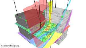 SeisWare International Inc. develops, markets and supports SeisWare™ software, an all-inclusive, PC-based seismic interpretation package. Version 7.0 of SeisWare software introduced the 3D Seismic Visualizer application, powered by Open Inventor, which brings powerful 3D visualization capabilities to this innovative interpretation software. Geoscientists use the SeisWare 3D Seismic Visualizer application to view sub-surface data in three dimensions. This demonstrates how their data looks below the earth’s surface and verifies the accuracy and validity of proposed drilling locations. To develop the 3D Seismic Visualizer application for their clients, the SeisWare team required a solution that would be cost-effective, robust, easy to implement and something SeisWare software could continually integrate with, as new functionality and enhancements are added to the interpretation package. The SeisWare product management team selected Open Inventor as a 3D toolkit for developing the 3D Seismic Visualizer, because the toolkit was cost effective, SeisWare’s in-house resources – with knowledge of Open Inventor and its C# interface – reduced development time, and it contained two key components: volume and surface visualization. Speed and power were two major benefits of using the Open Inventor toolkit, which allowed SeisWare to quickly produce a first version of their 3D Visualizer application. SeisWare’s users required the ability to view seismic data in a 3D format, such as full interactive display of 3D seismic volumes with well, tops, curves, faults, grids, and horizons; the ability to control the appearance of each data type; or to be able to rotate, slice and animate 3D seismic in real-time while interpreting. The Open Inventor integration made it possible to produce a fully functioning 3D Visualizer in a short amount of time.
