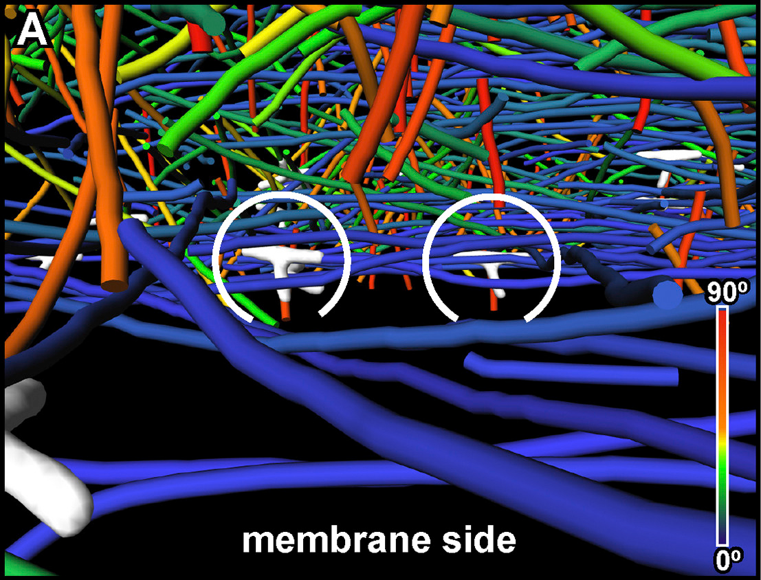 The 3D reconstruction with a final pixel size of 1.684 nm was obtained by weighted-back projection using IMOD and rendered in 3D using Amira. Filaments were automatically segmented using the actin segmentation package in Amira.[…] Binned twice tomograms were subjected to nonlocal-means filtering using Amira software provided by Thermo Fisher Scientific. Actin filaments were traced by an automated segmentation algorithm based on a generic filament as a template, with a diameter and length of 8 and 42 nm, respectively. To reduce background noise, short filamentous structures with lengths below 70 nm (or 40 nm in Figure 7) were filtered out.