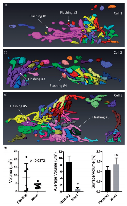 Mitochondria undergo spontaneous transient elevations in matrix pH associated with drops in mitochondrial membrane potential. These mitopHlashes require a functional respiratory chain and the profusion protein optic atrophy 1, but their mechanistic basis is unclear. To gain insight on the origin of these dynamic events, we resolved the ultrastructure of flashing mitochondria by correlative light and electron microscopy. HeLa cells expressing the matrix-targeted pH probe mitoSypHer were screened for mitopHlashes and fixed immediately after the occurrence of a flashing event. (…) Correlation of live/fixed fluorescence and electron microscopy images allowed the unambiguous identification of flashing and nonflashing mitochondria. Three-dimensional reconstruction and surface mapping revealed that each tomogram contained two flashing mitochondria of unequal sizes, one being much larger than the average mitochondrial volume. (…)